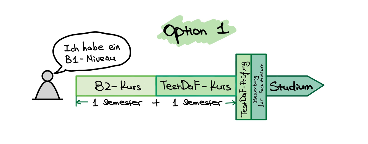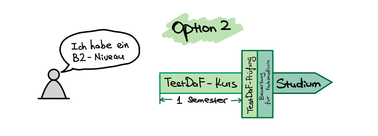 Sie besuchen ein Semester lang den B2-Intensivkurs und im darauffolgenden Semester den TestDaF-Vorbereitungskurs. Am Ende des zweiten Semesters schreiben Sie die TestDaF-Prüfung.