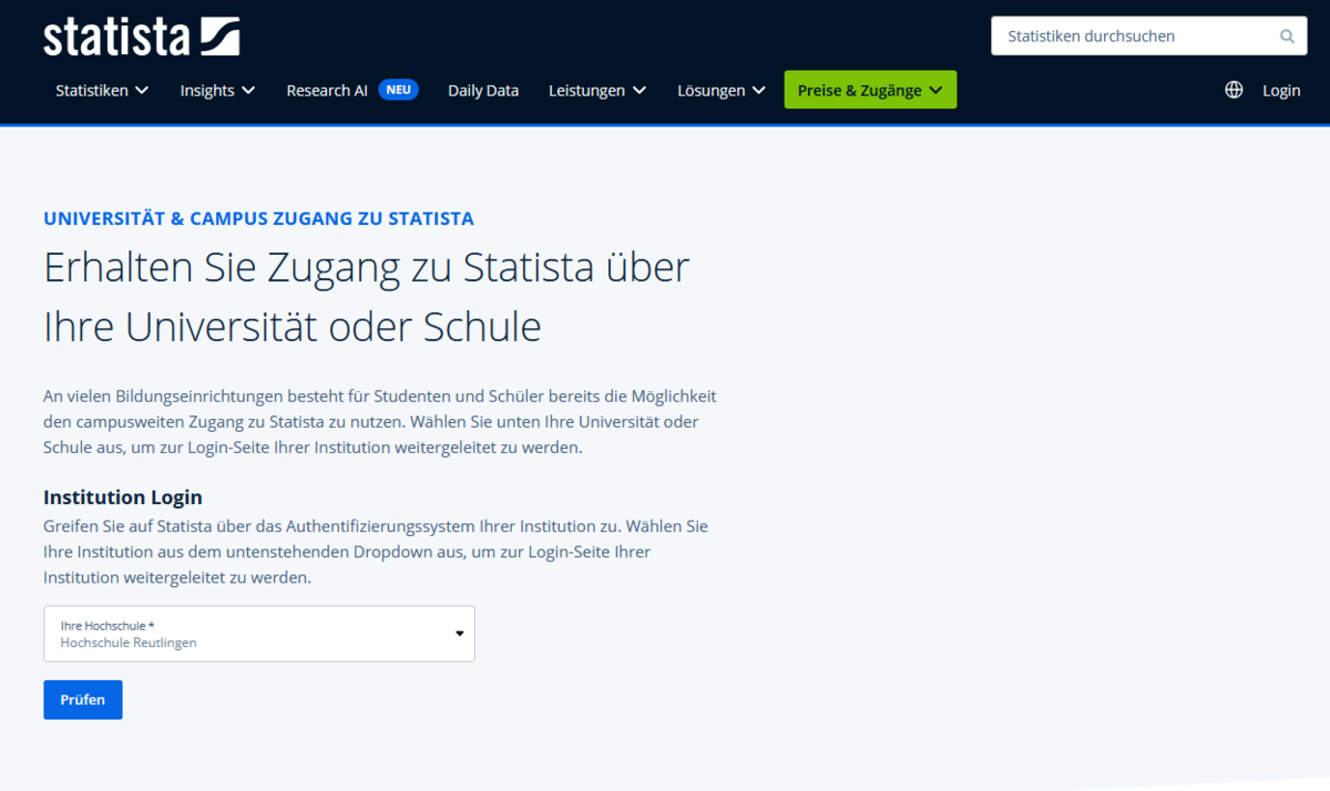 Bisher war keine weitere Registrierung bei Statista nötig. Um Statista weiter in vollem Umfang nutzen zu können, müssen Sie sich ab jetzt über das Institutionell Login mit Ihrem Hochschulkonto bei Statista anmelden.