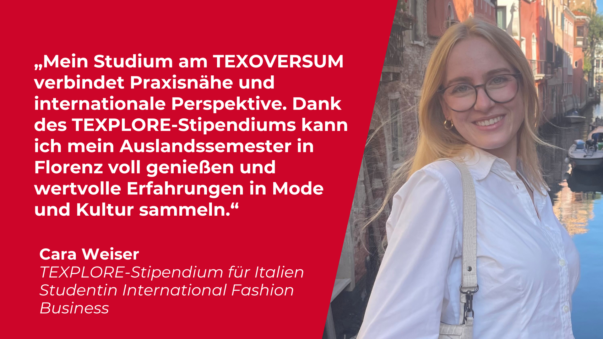 „Mein Studium am TEXOVERSUM verbindet Praxisnähe und internationale Perspektive. Dank des TEXPLORE-Stipendiums kann ich mein Auslandssemester in Florenz voll genießen und wertvolle Erfahrungen in Mode und Kultur sammeln.“ So beschreibt Cara Weiser, Studentin im Studiengang International Fashion Business, ihre Zeit an der Kent State University in Florenz. Besonders bereichernd waren die von der Universität organisierten Exkursionen nach Mailand und Venedig, die ihr neue Einblicke in die europäische Modewelt ermöglichten.