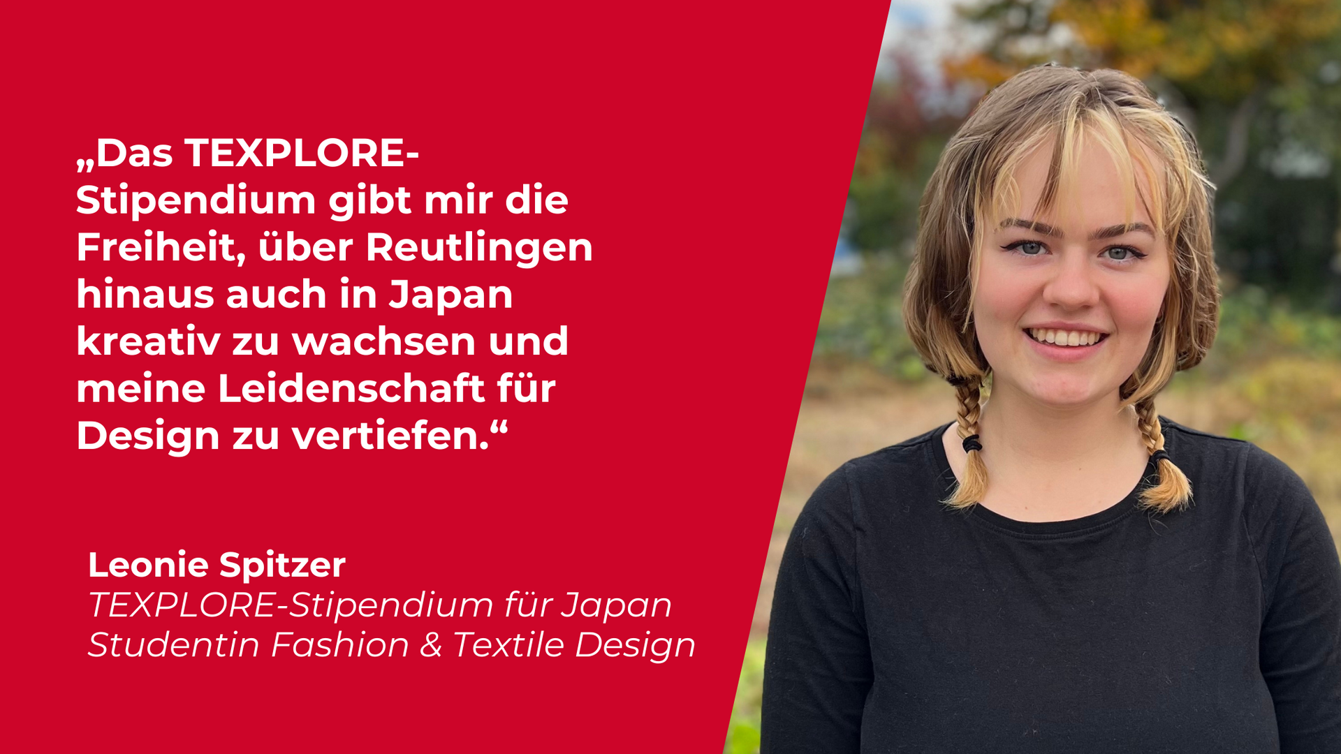 Auch Leonie Spitzer, Studentin im Studiengang Fashion & Textile Design, profitiert vom TEXPLORE-Stipendium bei ihrem Aufenthalt an der Yamanashi Gakuin Universität in Japan. Für sie stehen interkulturelle Teamarbeit und das Erlernen traditioneller japanischer Techniken im Mittelpunkt. „Das TEXPLORE-Stipendium gibt mir die Freiheit, über Reutlingen hinaus auch in Japan kreativ zu wachsen und meine Leidenschaft für Design zu vertiefen“, ergänzt sie. „Das Stipendium gibt mir das Gefühl, dass meine Leidenschaft gesehen und unterstützt wird und das bedeutet mir unglaublich viel. Es gibt mir die Freiheit, mich ganz auf kulturelle Erlebnisse einzulassen. Ich kann mich auf das konzentrieren, was mich antreibt: Neues zu entdecken, Menschen kennenzulernen und meine Erfahrungen in meine Arbeit einfließen zu lassen.“