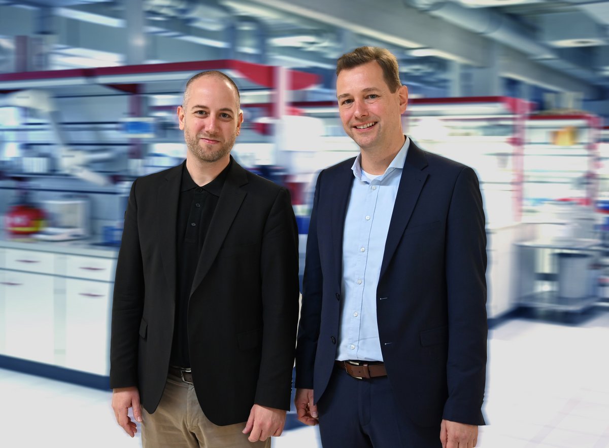 Frank Fischer, Bereichsleiter Personal und Recht bei RAMPF Holding GmbH & Co. KG (links) und Prof. Dr. Karsten Rebner, Dekan der Fakultät Life Sciences, besiegeln ihre weitere Kooperation im Innovationszentrum der Firma RAMPF in Grafenberg.
